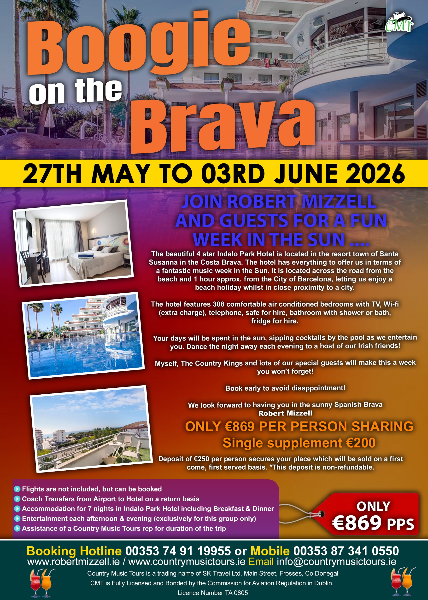 Join Robert Mizzell & the Country Kings and a host of exiting names from the Irish entertainment world, on a fun filled week in Santa Susanna in sunny Spain.